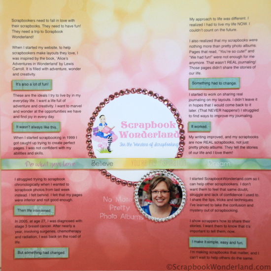 Thanks for letting me have this prompt Lain! My only dilemma was deciding which angle I was going to take for this page! I decided to create a layout that talks about why I started sharing scrapbooking tips online. Alice’s Adventures in Wonderland is filled with adventure, wonder and creativity and that’s the way I try to live my life, so naming my website Scrapbook Wonderland seemed appropriate. I love sharing scrappy tips because I wasn’t always a confident scrapper. I struggled, especially with journaling, and now that I have solutions I can’t wait to share them. I’m helping others find the joy in scrapbooking so they will tell their stories.
