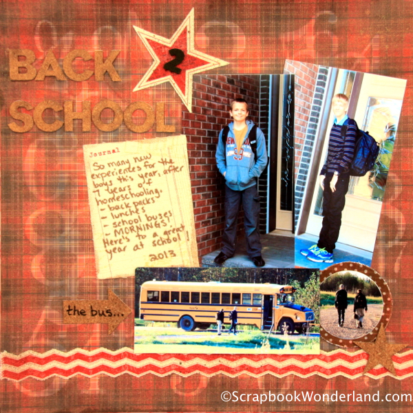 We have been homeschooling for the past 7 years. Scrapbooking the first day of a school is a classic scrapbookers go-to layout, and I have been denied this staple page for 7 years! With my boys heading back to school this fall I was excited to have ‘real’ back to school photos. I even took photos of them getting on the bus! (With my zoom lens, from the house, I tried not to be totally embarrassing!)
