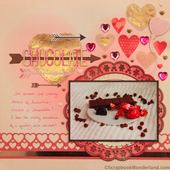 I love chocolate, too! Your description is PERFECT! Wonderful layout, and I love all the hearts, especially the gold ones! They add an even more luxiourious feel to the page!