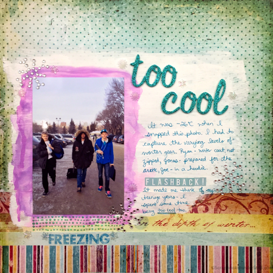 I love this layout. Down here in Texas it can get quite cold because of the humidity factor. It never stopped my son from wearing his shorts and flip flops in a wintery mix of ice and hail. When we lived in Corpus Christi, TX near the Gulf of Mexico, we had a miracle Christmas Eve snowfall of 14 inches. There were kids posing in their bathing suits and boogie boards under the palm trees! Quite a site! Plastic bags were put over their shoes…mittens and snowshoes cannot be bought in South Texas! Ha!