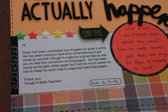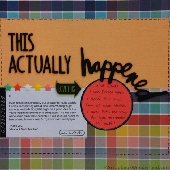 Hey! It’s Friday. Normally I like to share a fun scrapbooking quote, but today I have something else that will make you chuckle. I scrapbooked a funny story, and I’m happy to be sharing it here today, with my son’s permission! Lol! 😉