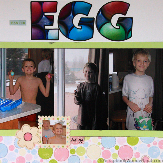 To create this title I printed one large copy of the egg photo and cut it using a Cricut die cut machine. (These letters are using the “Mickey Font” cartridge.)