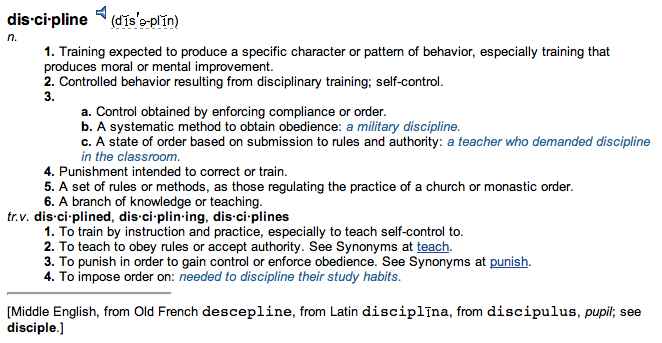 It seems like such a rough and tough word, but I think that ‘discipline’ has been unfairly categorized. There is so much meaning in the word. Most people automatically skip to thoughts of punishment and control, however on www.thefreedictionary.com this is the definition: