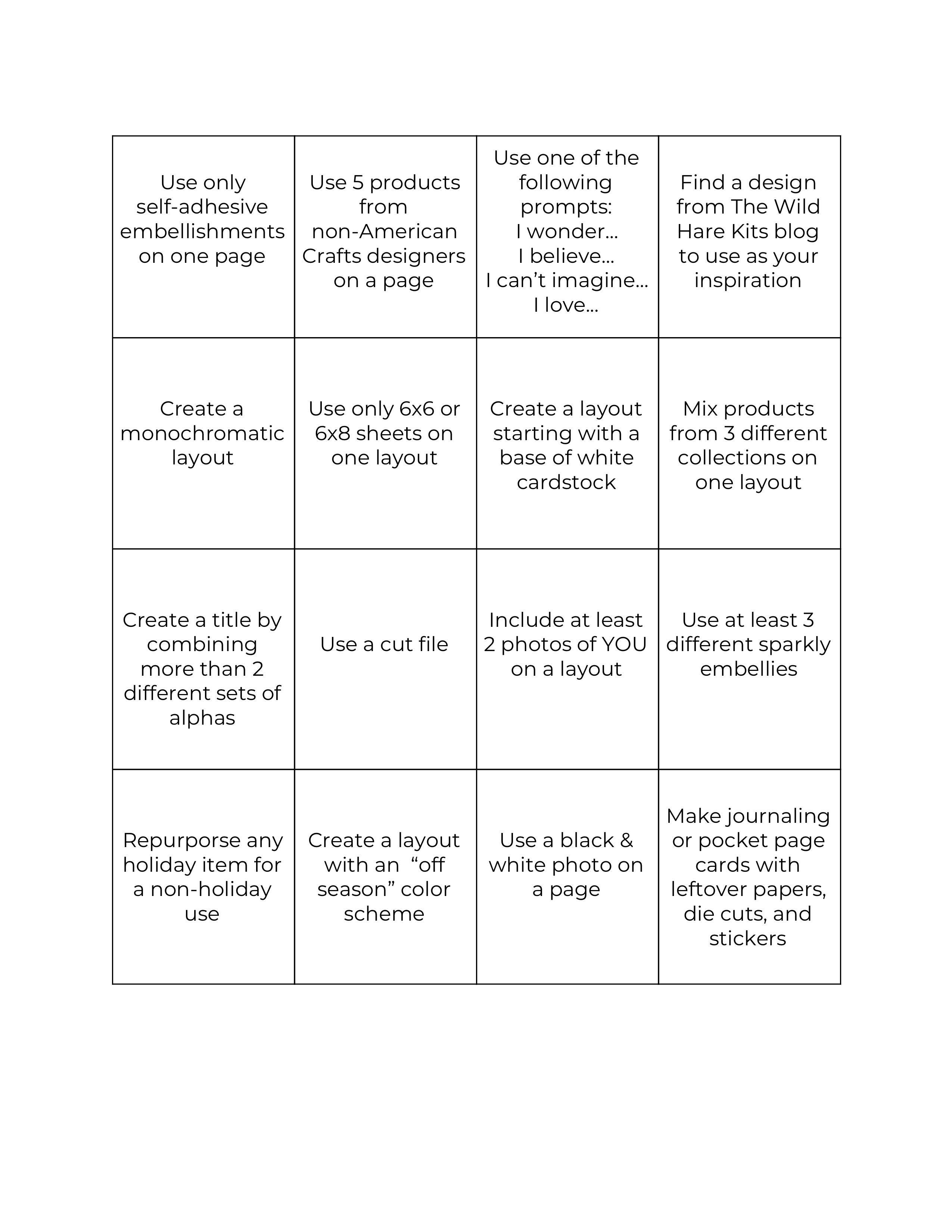 To make things fun, Alison Girling from the Wild Hare Kits has created a Challenge Board for us to play along with! Here’s the board, and you can download it by clicking this link:
