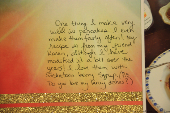 One thing I make very well is pancakes. I even make them fairly often! My recipe is from my friend Karen, although I have modified it a bit over the years! I love them with Saskatoon berry syrup. (P.S. Do you love my fancy dishes?)