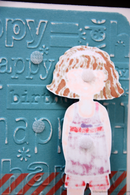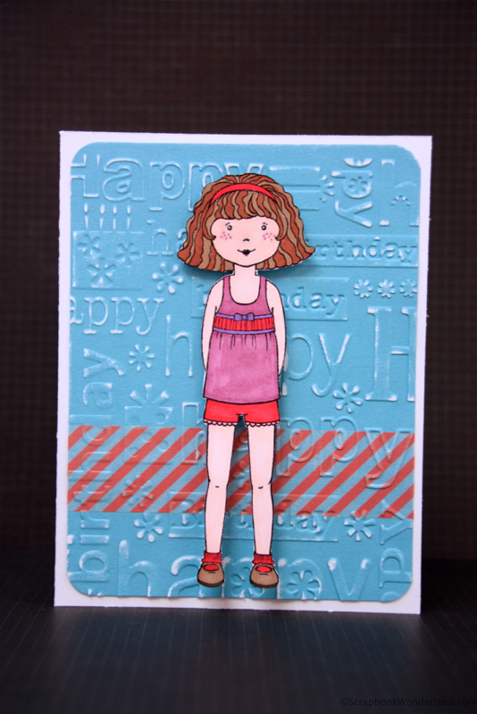 The card has a cute paper doll on the front. She is sitting on a sheet of embossed paper that has been lightly sanded. Before the paper was embossed a strip of washi tape was wrapped around it.