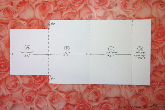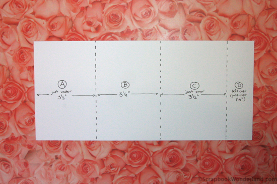 Score the 12″ piece of cardstock three times creating 4 sections A-D. A. Just under 3-1/2″ B. 3-1/2″ C. Just over 3-1/2″ D. You will have a section left at the end of just over 1 inch. Did you find yourself asking, “What’s ‘just under’ 3-1/2 inches mean? I generally use about 1/8” less, and more when making my score marks. Is that better? 😉