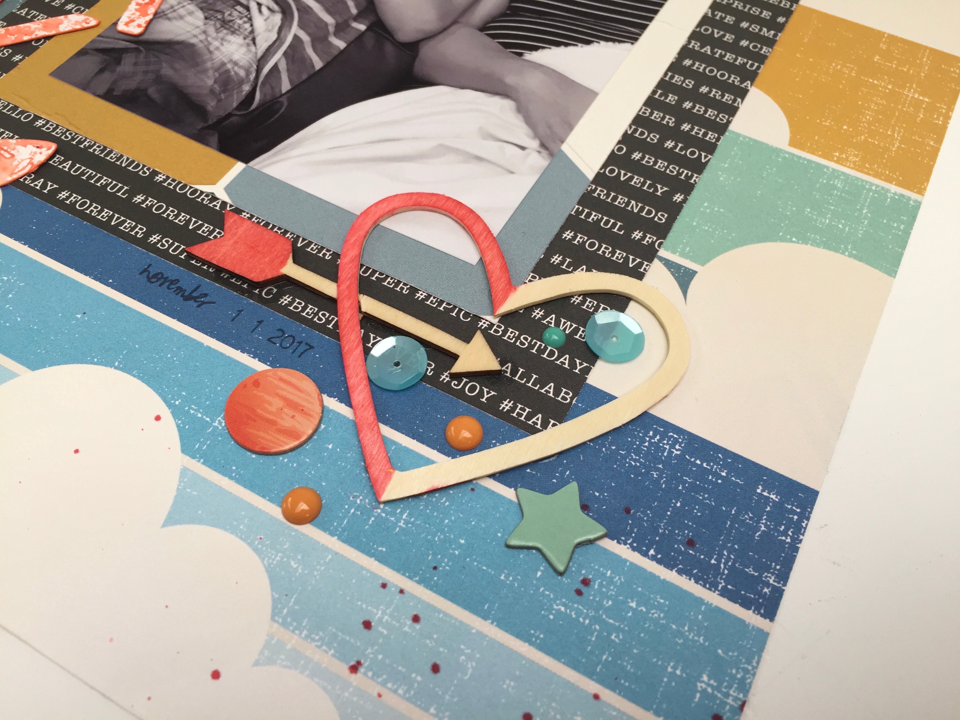 When I found the wooden heart I thought I’d just colour it to match the layout. The one side of the heart was printed and the ink wouldn’t stick, so I flipped it over and used the back.