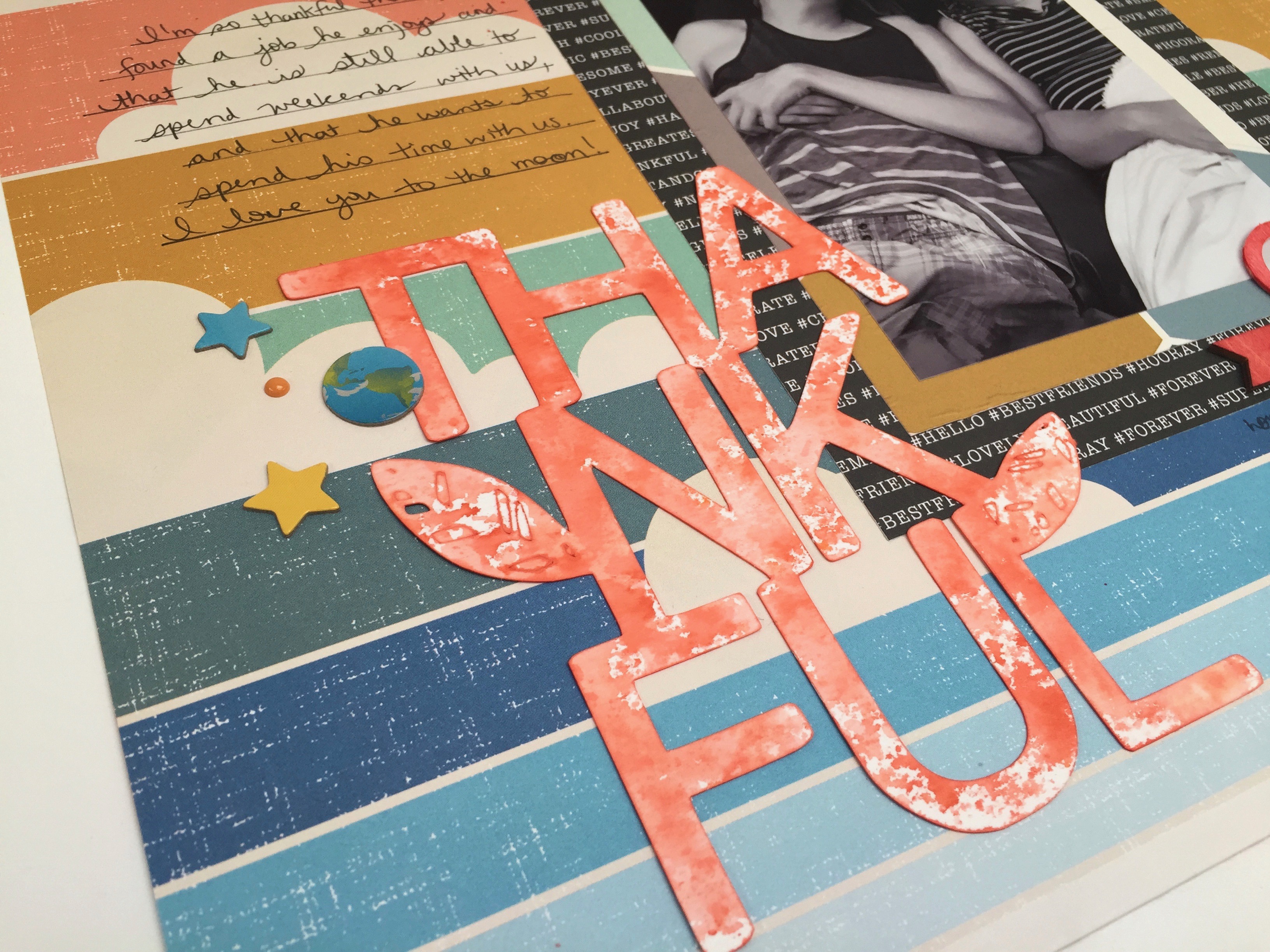 This month my kit was a stunning success. I really loved the items in my kit. Some of the requests in my profile were geometric prints, acrylic, supplies for pocket scrapping, sequins, and I was even hooked up with some yellow Thickers that I was longing for! As a bonus the kit included a ‘Thankful’ cut file.