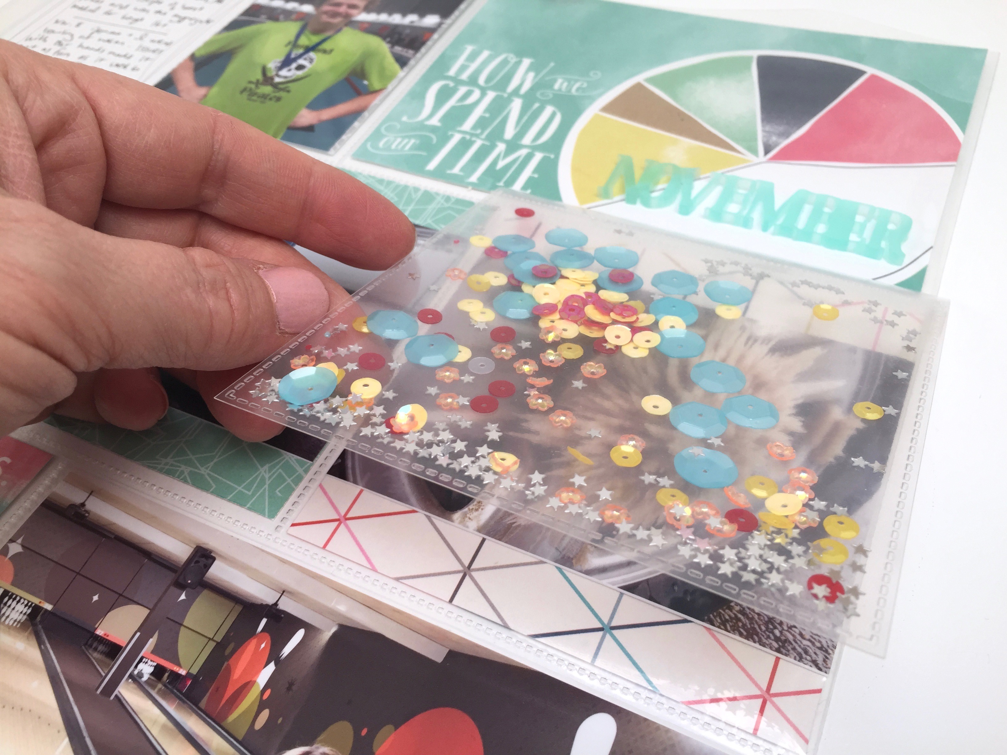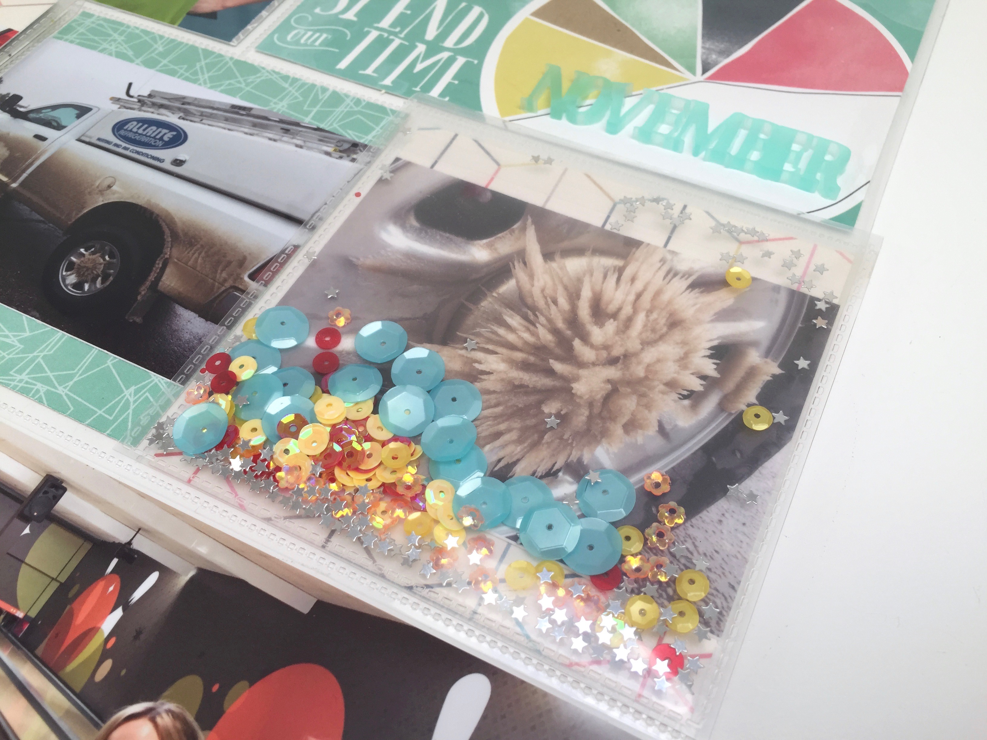 I was excited that I remembered the beautiful acrylic ‘November’ that I’d been saving since last year. Then I thought it would be fun to pull out that Fuse tool again to make another shaker pocket.